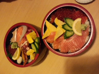 > 今日のご飯は、何にしょうかと迷いながらドライブをしていると、そこにお店が…(>_<)海鮮丼を食べる事にしました(^O^)/お刺身も海鮮丼もとても美味しかったです(o^-')bただ…ビールが欲しかったです(ToT)運転手は大変です。。。。(〃_ _)σ‖