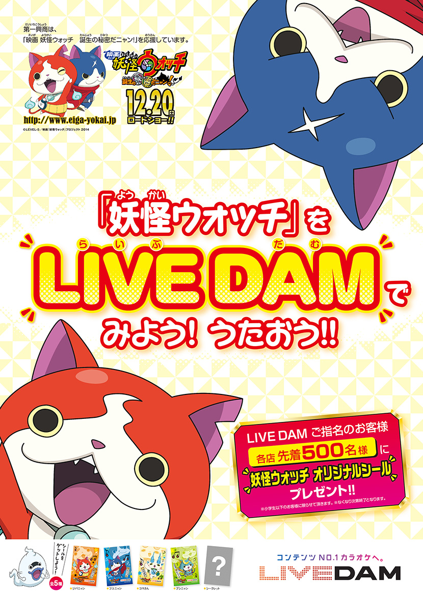 カラオケの「LIVE DAM」をご指名のお客様先着500名様に”妖怪ウォッチシール”をプレゼント♪