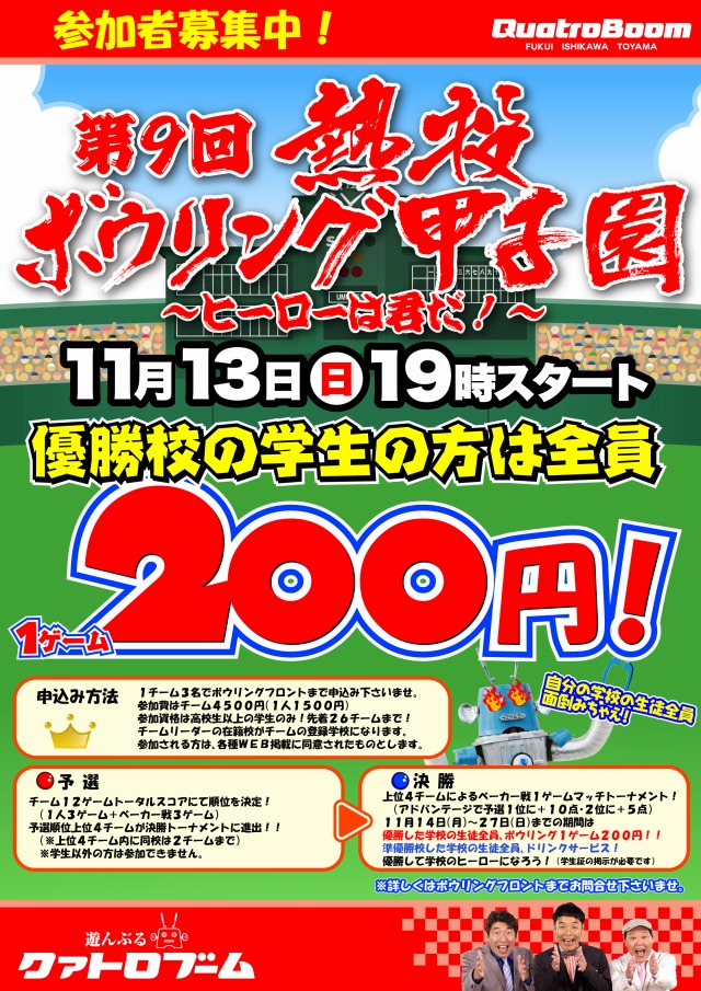 見事優勝すると、期間中その学校の生徒全員「ボウリング1ゲーム200円」になるという神企画!