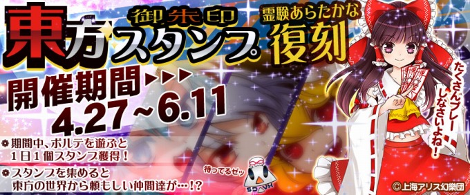 ヽ(*・ω・)ノさらニ!例大祭に先駆けテ、27日カラ東方スタンプが復刻しマス!霊夢ちゃんと一緒なら連休も楽しいこと間違いなしなのデスッ!博麗神社への参拝お待ちしておりマス♪